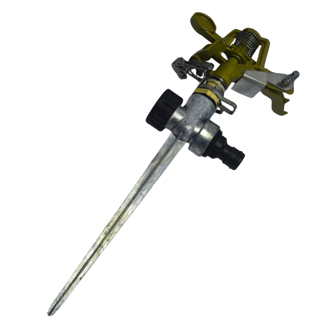 Fabricado em metal, ideal para regar seu gramado, plantas, flores, hortas e muito mais. Seu sistema de giro entre 30º e 360º ajustável, com bico projetado para jatos direcionados e de grande alcance, fazendo assim com que a irrigação fique por igual em toda a região coberta, além de ter um sistema que imita realmente as gotas da chuva, não concentrando em um único lugar apenas.